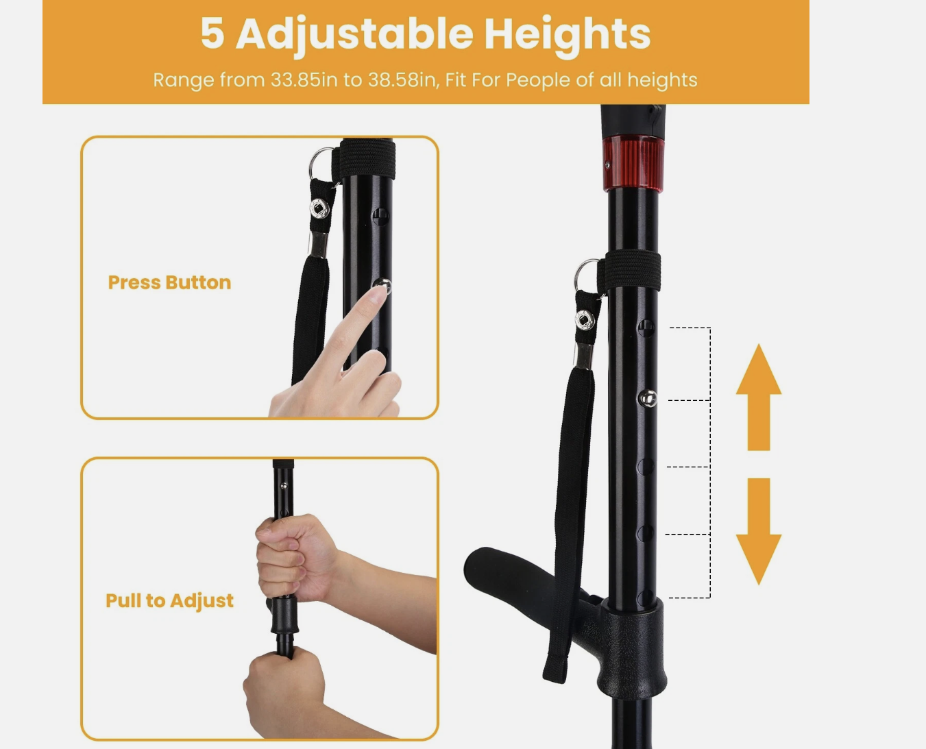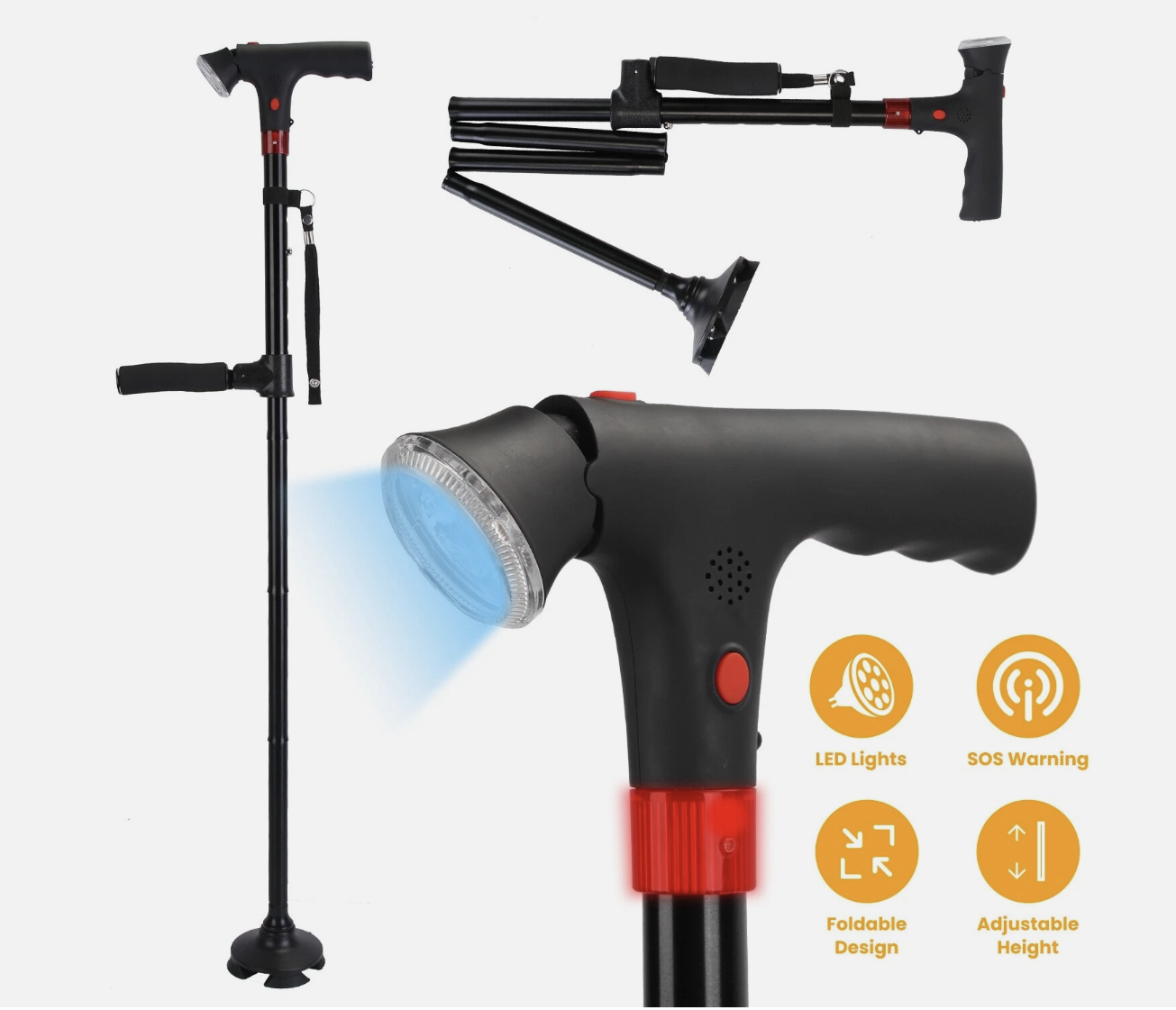 Enhance your safety and mobility with this versatile, foldable walking cane. Featuring an integrated LED light for nighttime visibility, an adjustable height for personalized comfort, and a built-in SOS alarm for emergencies, this lightweight cane is designed for ultimate independence and peace of mind.