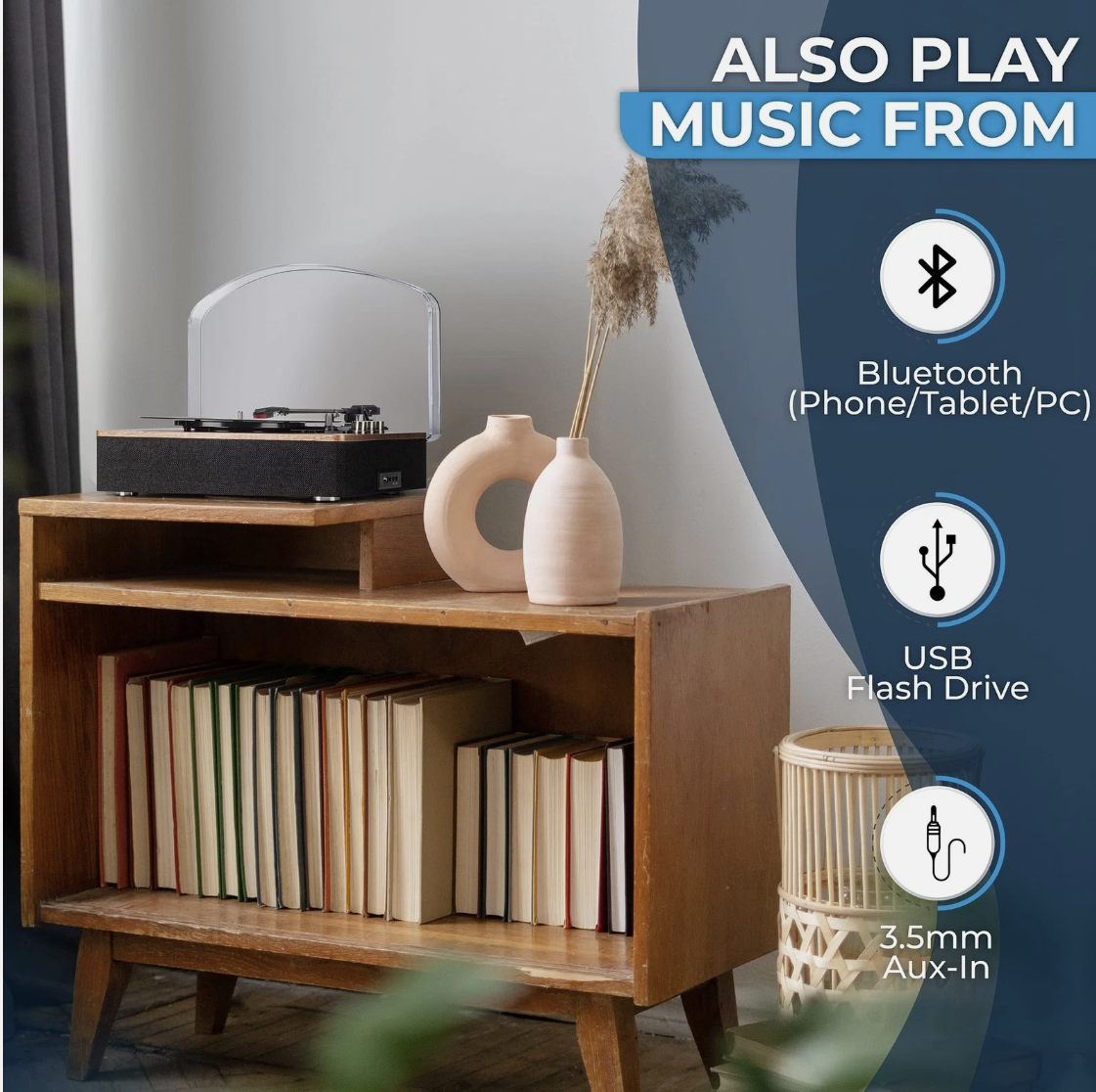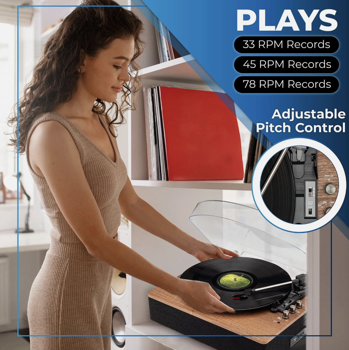 Relive the golden age of music with this charming retro wooden turntable. Featuring three-speed playback for all your vinyl records and convenient built-in stereo speakers, it’s perfect for enjoying your classic albums with warm, authentic sound.